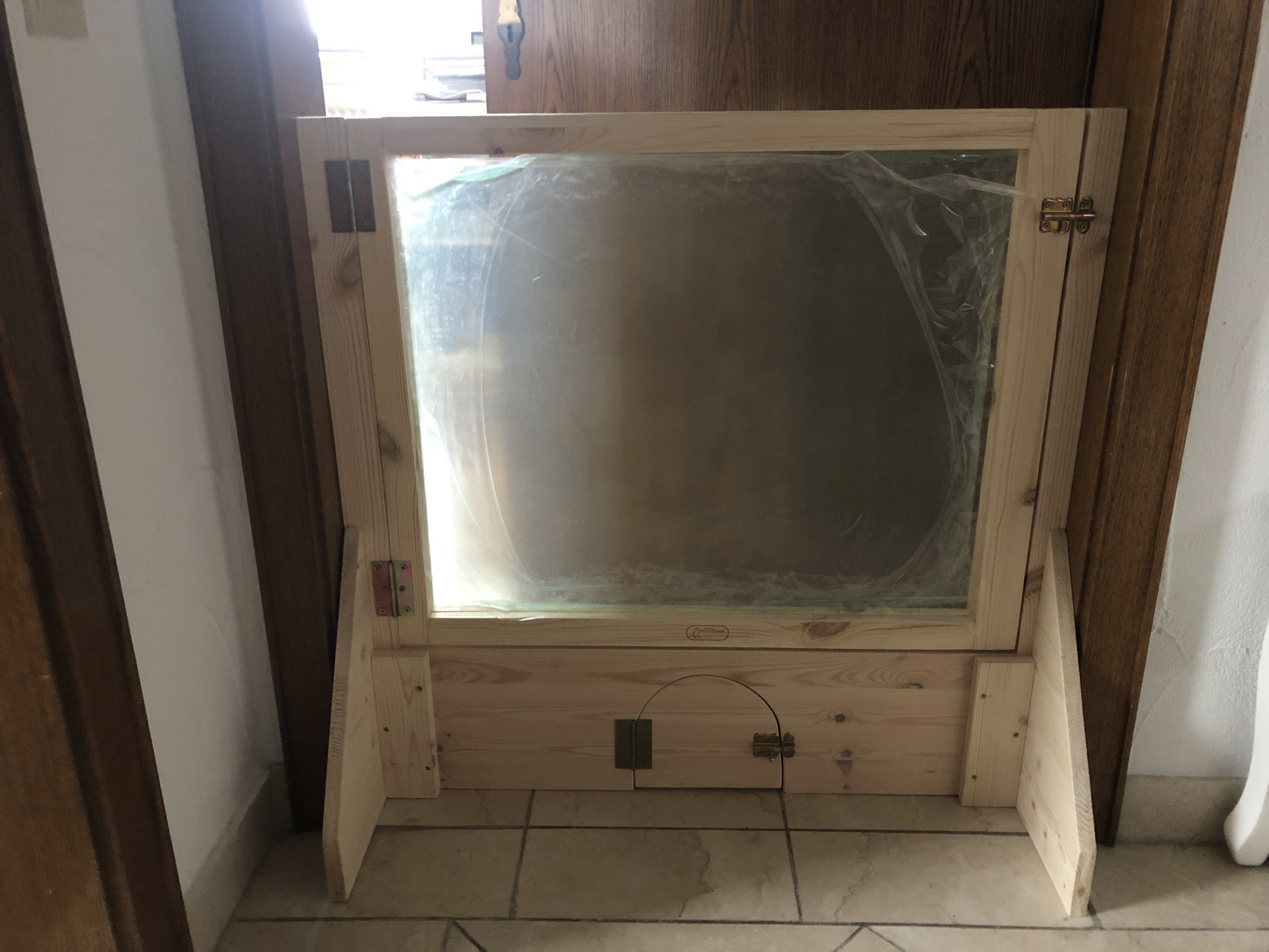Die Absperrtür besteht aus einer fertig montierten Holztür mit einer transparenten Acrylglasscheibe - baugleich wie unsere Gehege-Türen- sowie 4 separaten Holzstützen zum Anschrauben. Die Stützen sind vorgebohrt und lassen sich mit den beigefügten Schrauben einfach und schnell an der Tür befestigen.