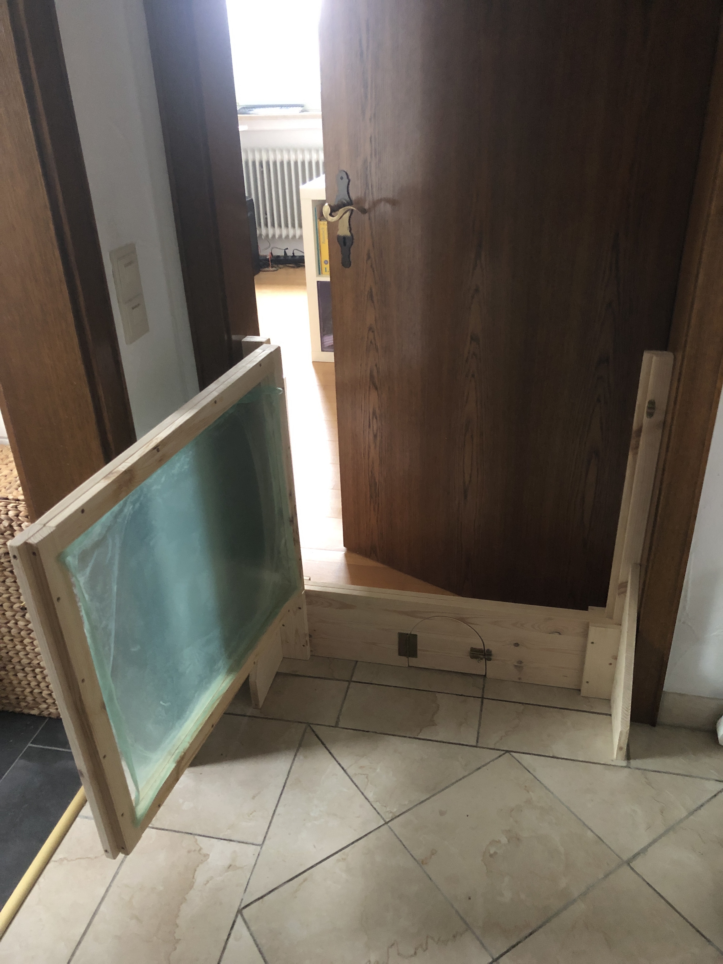 - Wir empfehlen das Anschrauben der Stützen direkt an der Position an der die Tür später stehen soll, um eventuelle Unebenheiten im Boden anzugleichen. Sollte die Absperrtüre trotzdem noch wackeln oder ein wenig rutschen (oft bei älteren Wohnungen oder Fliesenböden der Fall) empfehlen wir etwas Antrutschgummi oder ein Stück Teppich unterzukleben. Eventuelle Spalten oder kleine Höhenunterschiede lassen sich auch gut mit Kartonstückchen o.ä. angleichen.