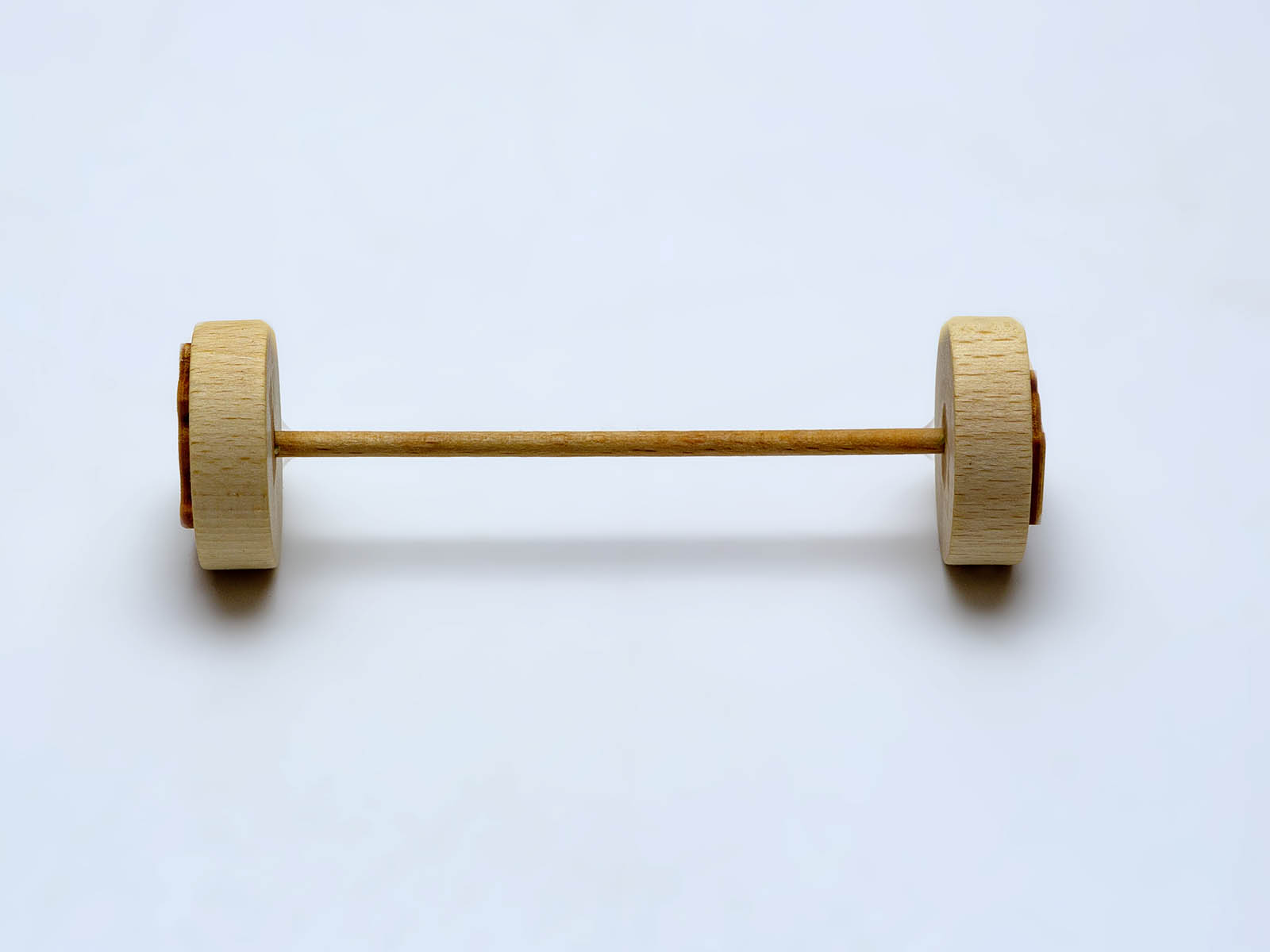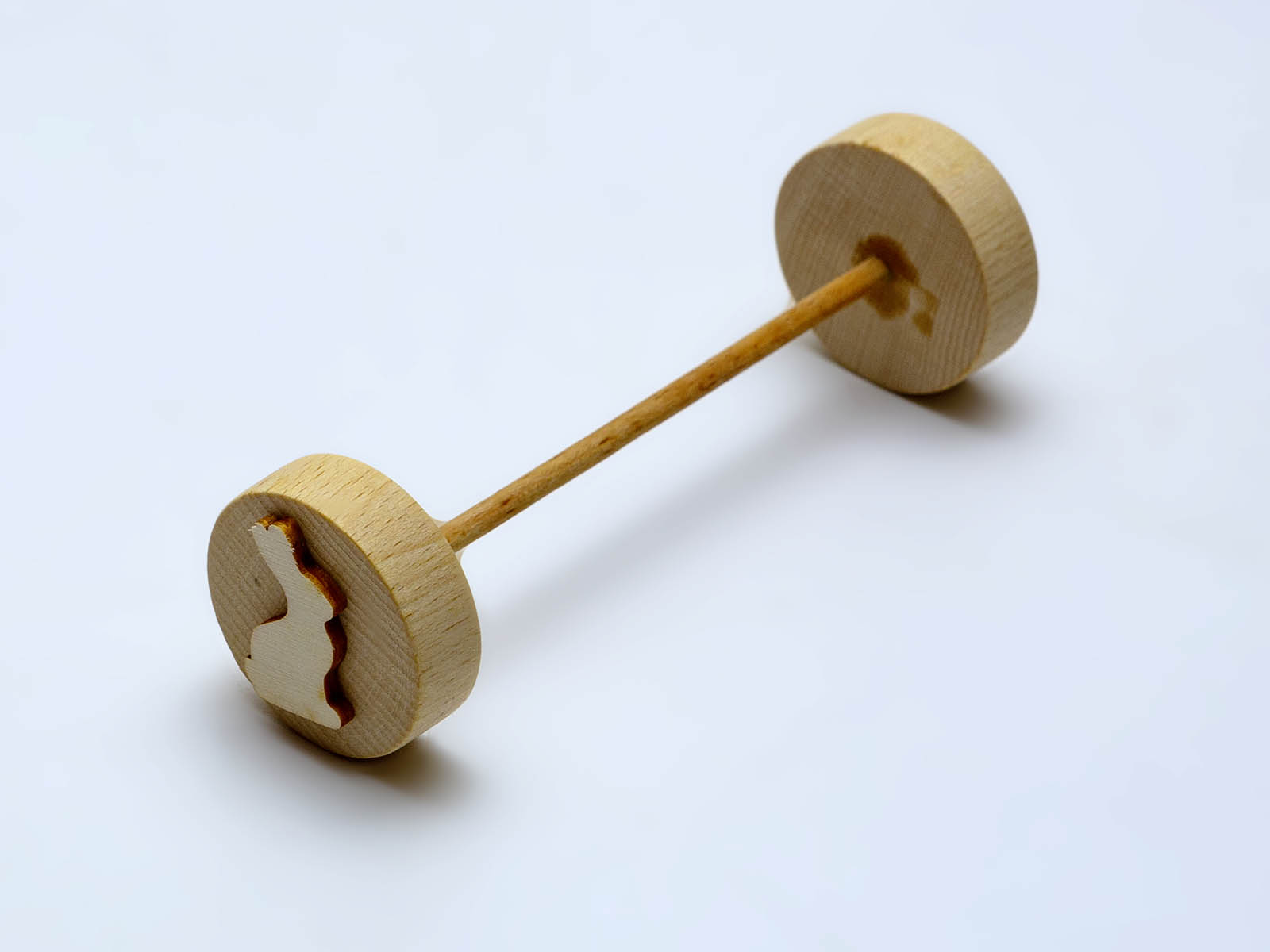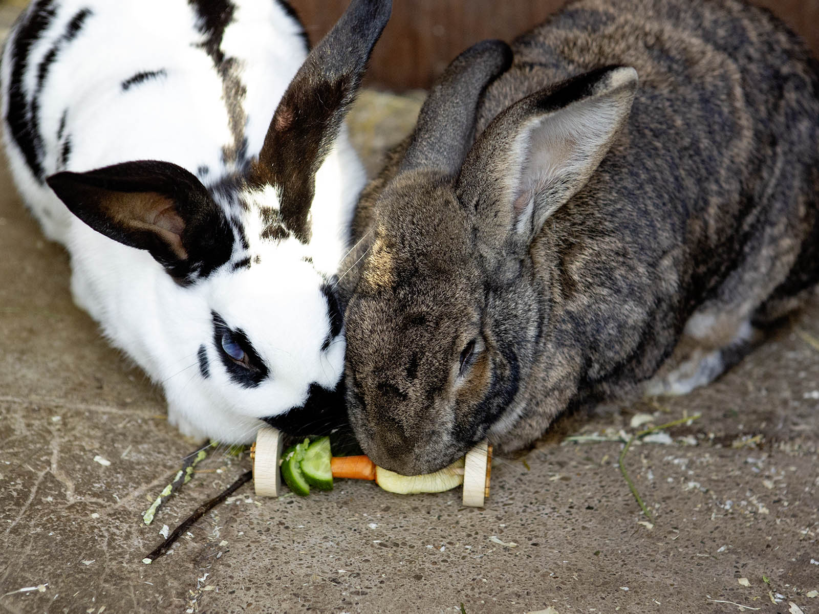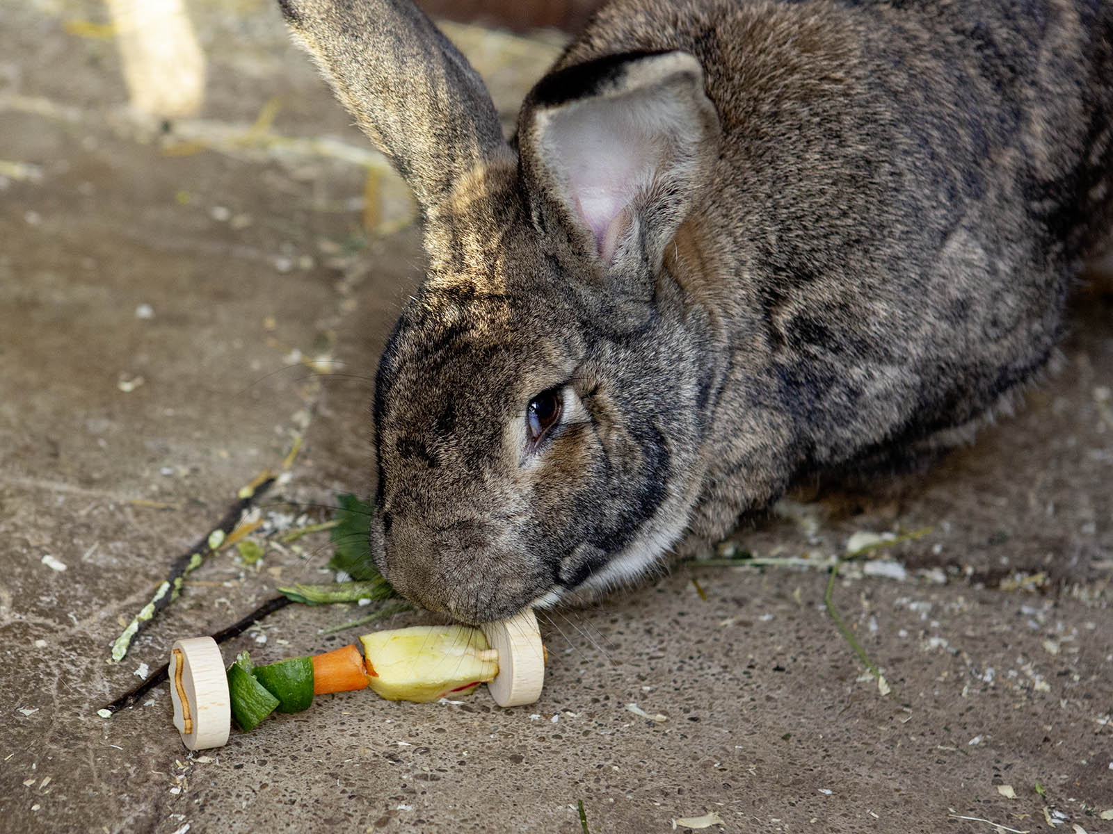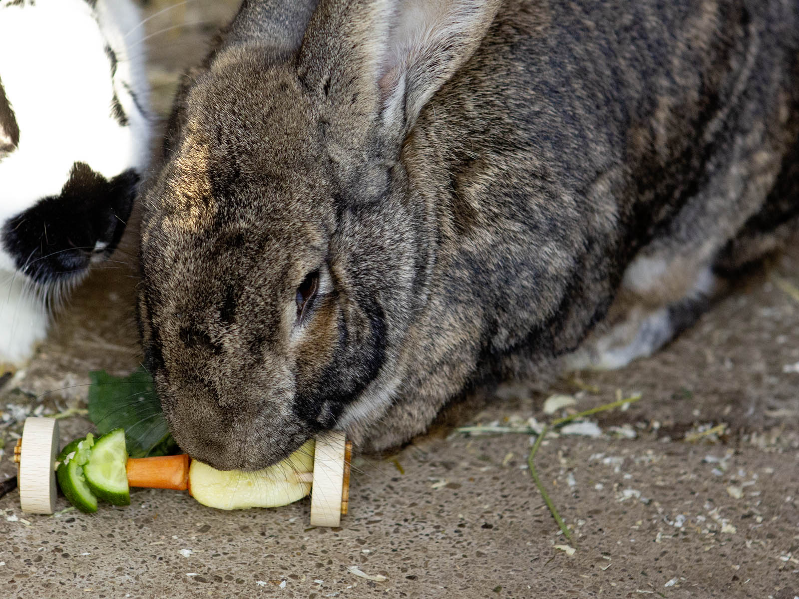 Die Futterhantel Rolli ist ein kleines Spielzeug, bei dem die Fellnasen sich ihr Futter erarbeiten müssen. Die Hantel besteht aus zwei Holzscheiben welche mit einem Holzstab verbunden werden. Die Scheiben lassen sich einfach abziehen, so können auf den Stab kleine Obst- und Gemüsestückchen oder Leckerli aufgespießt werden. Anschließend die Scheibe wieder aufstecken und der Futterspaß kann beginnen. Dadurch dass die Hantel rollt bleiben die Kaninchen in Bewegung während sie sich ihr Futter holen wollen. Aber auch ohne Futter ist die Hantel für viele ein beliebtes Spielzeug welches gerne mit den Zähnen durchs Gehege geworfen wird.