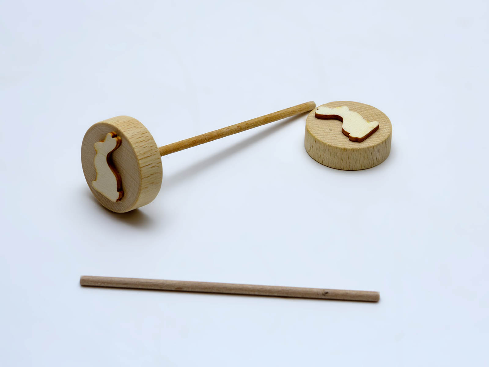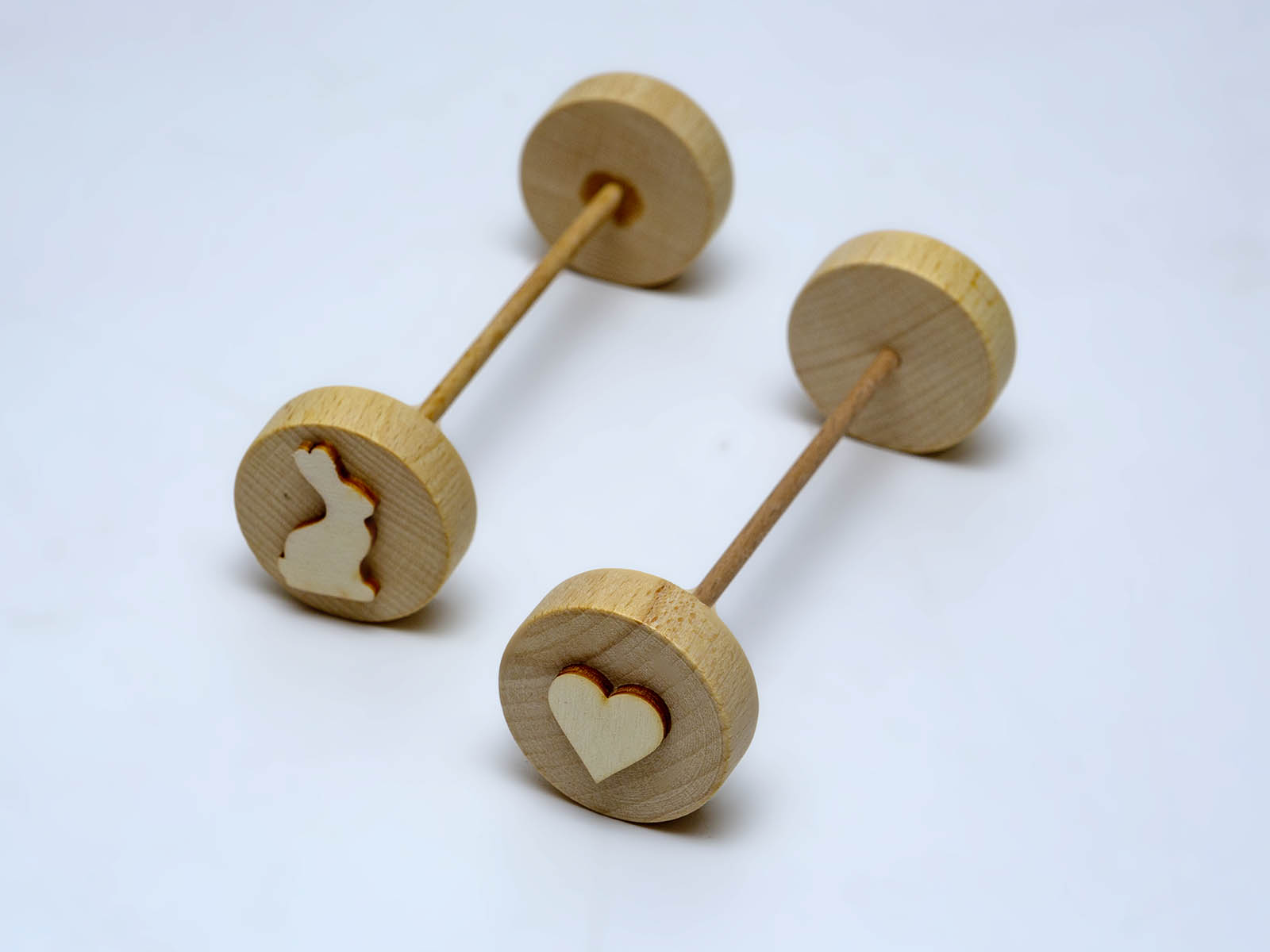 Die Holzscheiben sind wahlweise mit einem kleinen Dekokaninchen oder Dekoherzchen verziert, ein Ersatzspieß wird mitgeliefert.