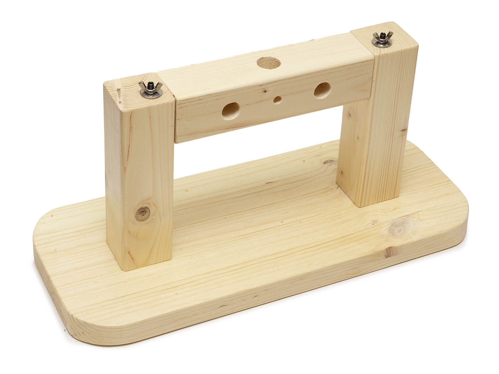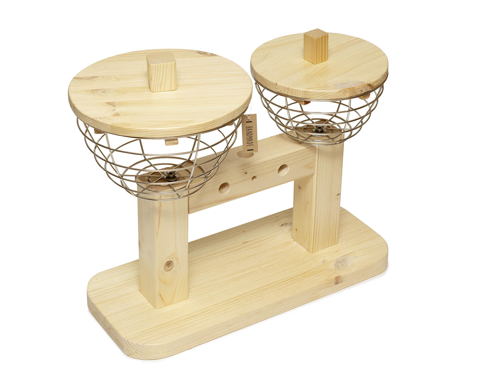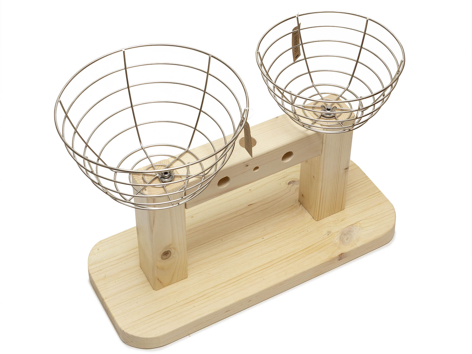 Der Futterständer besteht aus einem großen Standfuß mit abgerundeten Ecken, zwei ca. 25 cm hohen Stämmen sowie einer Querverbindung mit Löchern. In diese Löcher können zusätzlich z.B. noch Äste gesteckt werden. Auf jedem Stamm wird oben ein Korb angebracht. Sie haben hier die Wahl zwischen verschiedenen Körben. Die Körbe werden aufgesteckt und mit einer Mutter fixiert. Zum Reinigen können sie so ganz leicht und ohne Werkzeug abgeschraubt werden.
