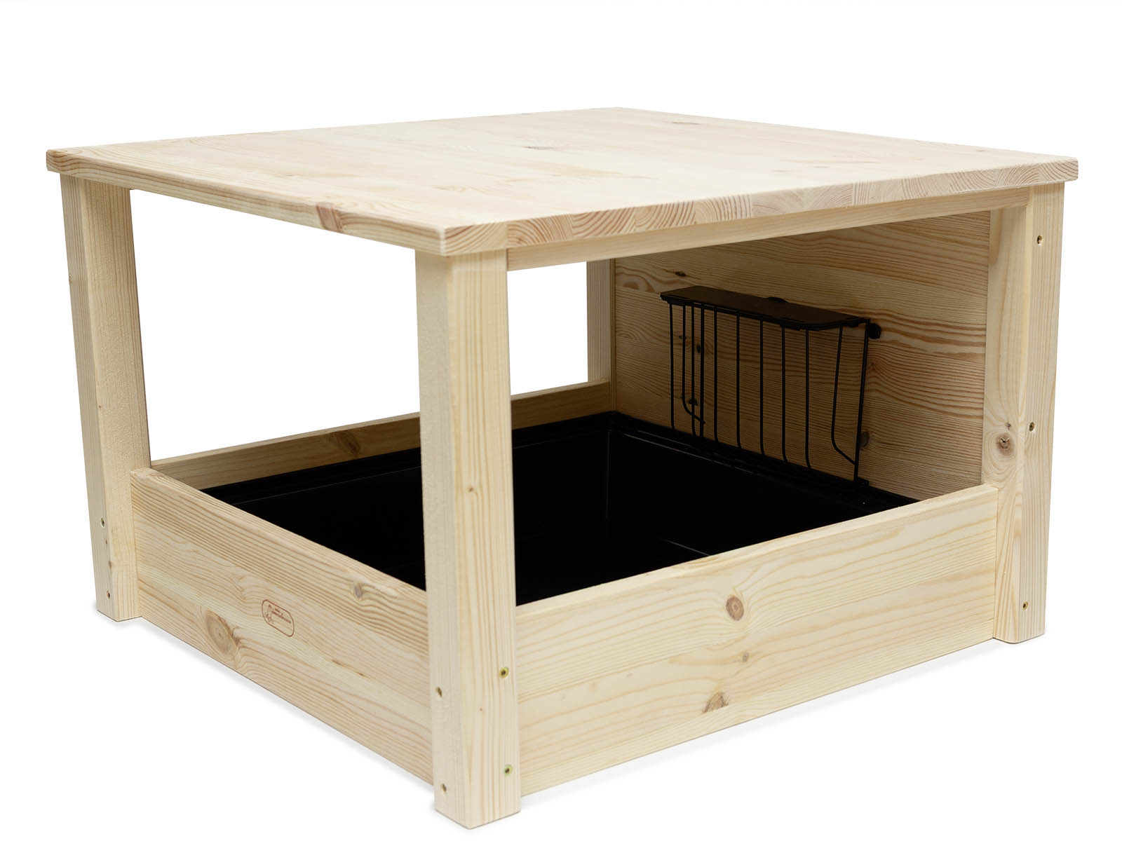 Die Heuraufe hat einen Kunststoffdeckel sowie einen Gitterabstand von ca. 3 cm, so dass kein Verletzungsrisiko besteht.