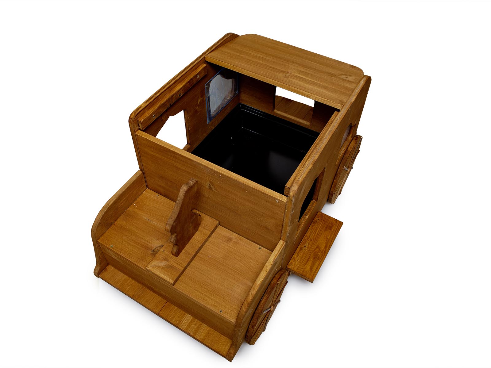 Vor der Kabine befindet sich eine weitere kleinere Sitzbank. Für diese Sitzbank liefern wir einen kleinen Holz-Hasi als Kutscher mit. Dieser kann auf die vordere Bank gestellt werden oder auch anderweitig als Deko verwendet werden :-)