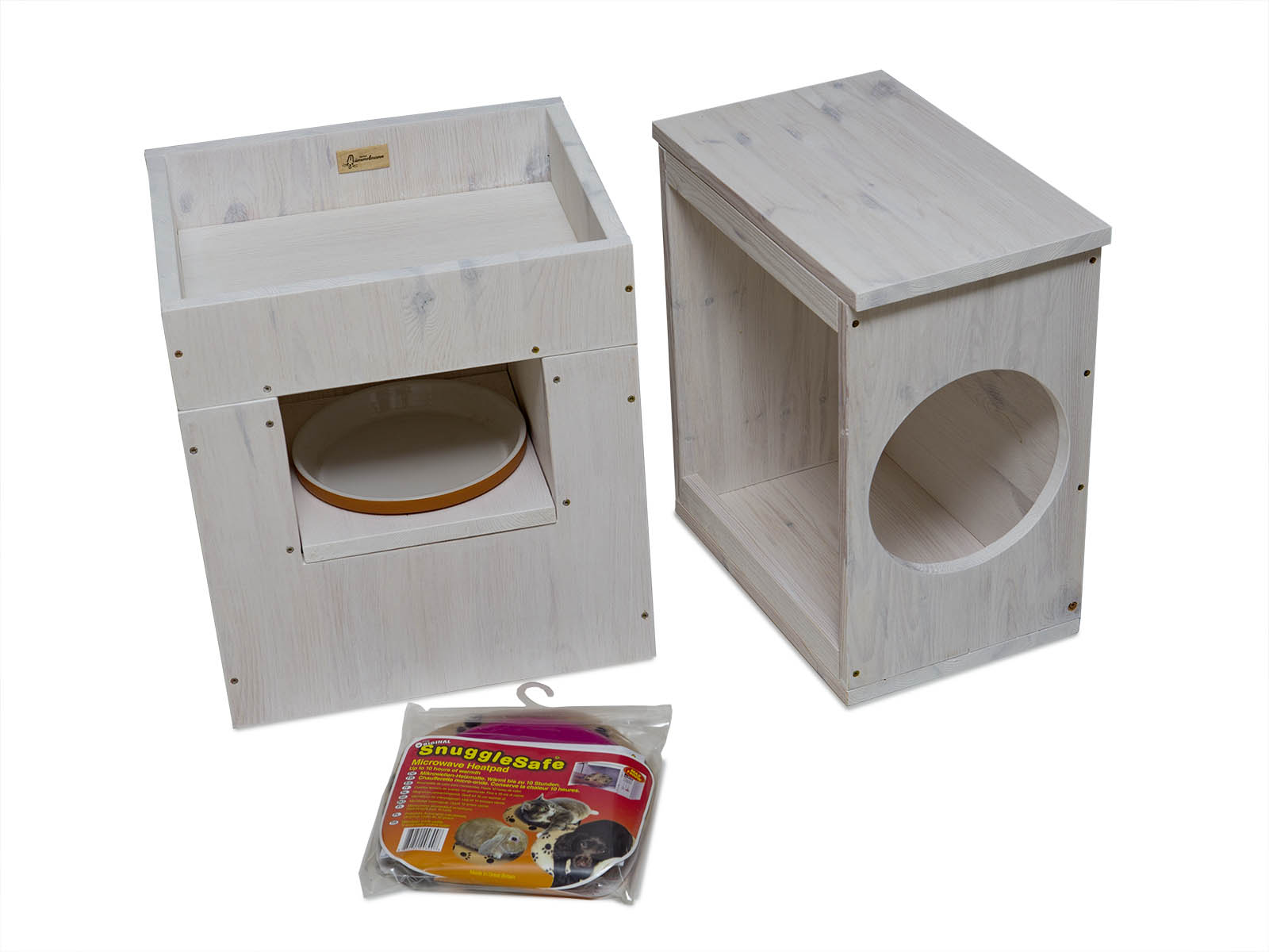 Leimholz Kiefer/Fichte (Passage+Bar), Ton (Napf), Kunststoff/Textil (Wärmekissen)
