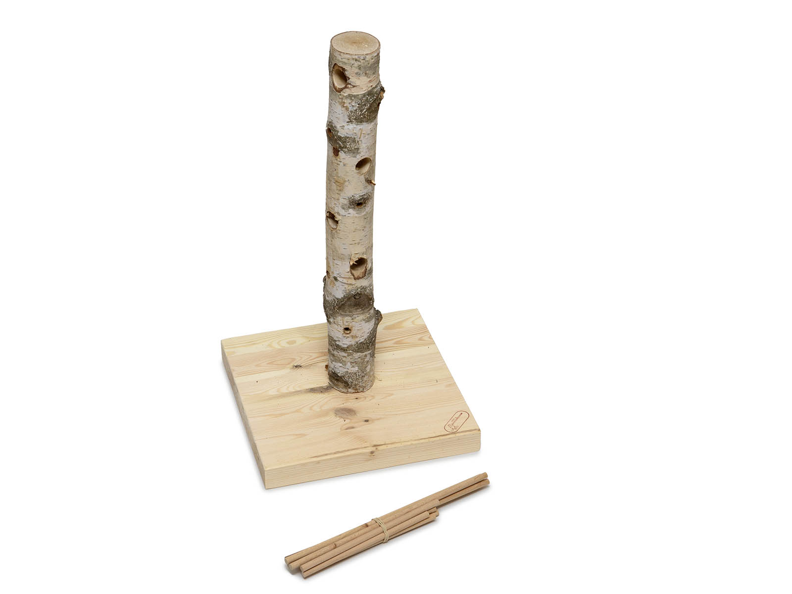 Für die kleinen Löcher können Sie optional noch 5 Buche-Rundstäbe oder kleine Naturäste auswählen. Auf diese wiederum lassen sich Leckereien stecken oder große Salat-/Kohlblätter hängen.