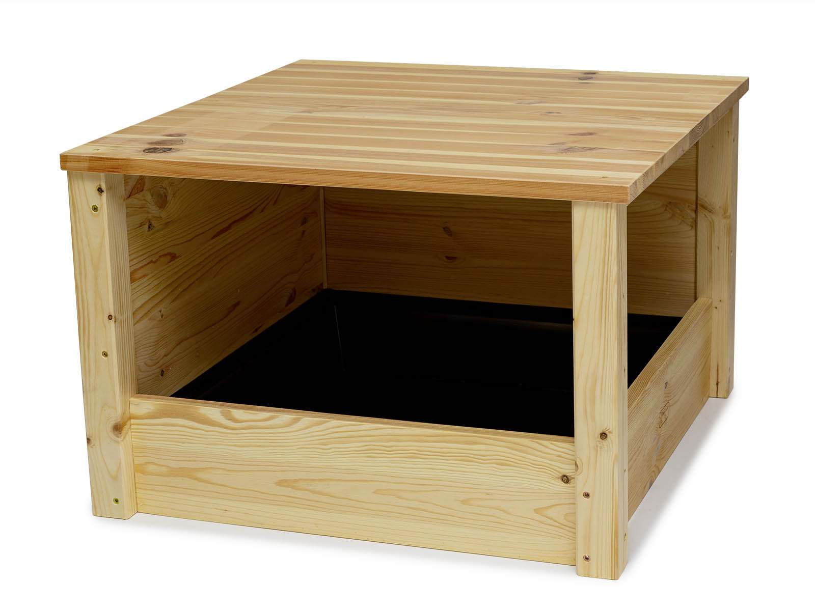 Der Sandkasten besteht aus einem Holzrahmen mit vier Stützbalken, einem fest verschraubten Flachdach und einer herausnehmbaren Kunststoffwanne in 50 x 50 x 10 cm. Im Gegensatz zu unserem Sandkasten "Greta" mit Spitzdach bietet das Dach von "Luisa" zudem noch eine erhöhte Liege- oder Aussichtsplattform.